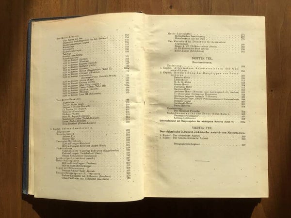 Boek Duitstalig over motorboten en bootmotoren. Oud boek van 1910 met heel veel tekeningen in het boek en een paar uitklapbare tekeningen. Echt boek voor de liefhebber in de hogere prijsklasse.
