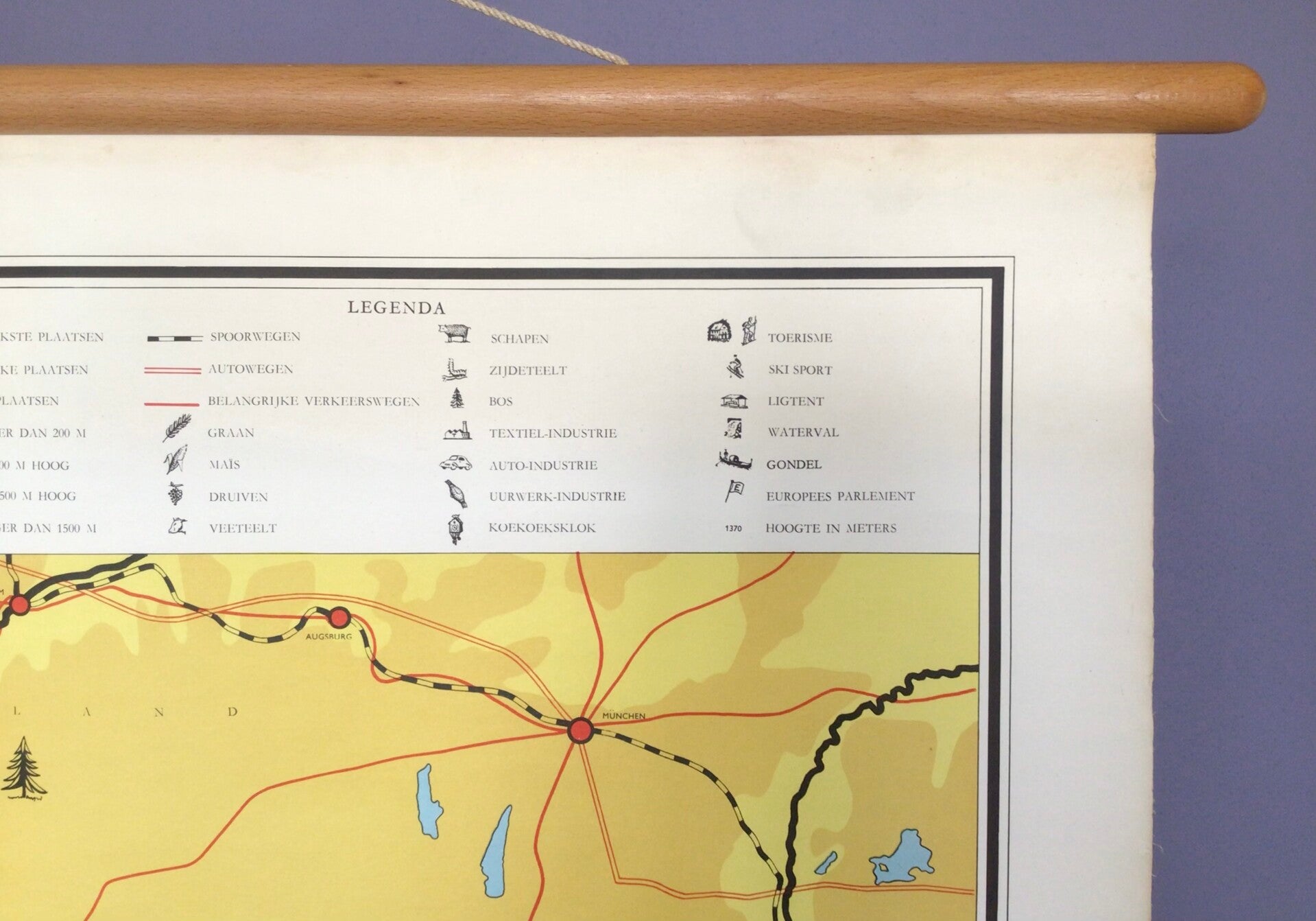 Prachtige, oude kaart van Kloosterman, Koekkoek en Van Mourik, uitgegeven door Van Goor. De kaart is gedrukt op linnen, oprolbaar en bevestigd op houten stokken.