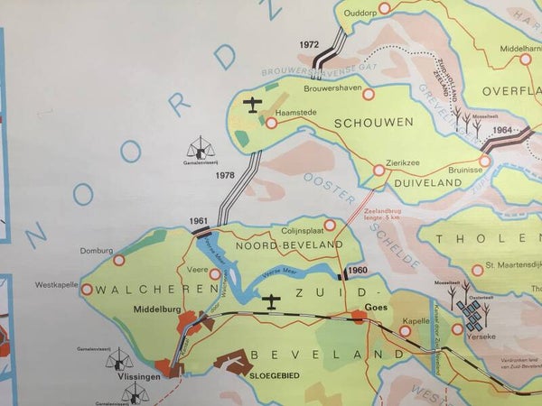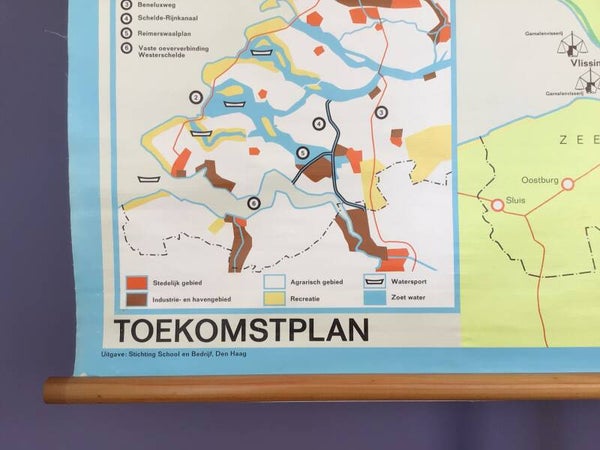 Overzichtelijke kaart van het Deltaplan op linnen en oprolbaar door middel van stokken.Met informatie over plaatsen, wateren, de stormvloedkeringen en met een inzet van de stormramp in 1953, het toekomstplan en met een handige legenda.