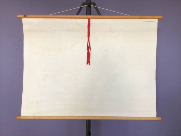 De kaart is op linnen gedrukt en oprolbaar op houten stokken.