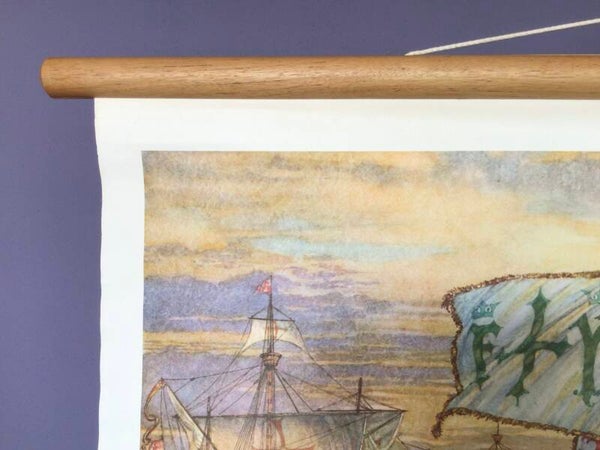 De kaart is op linnen gedrukt en oprolbaar op houten stokken.