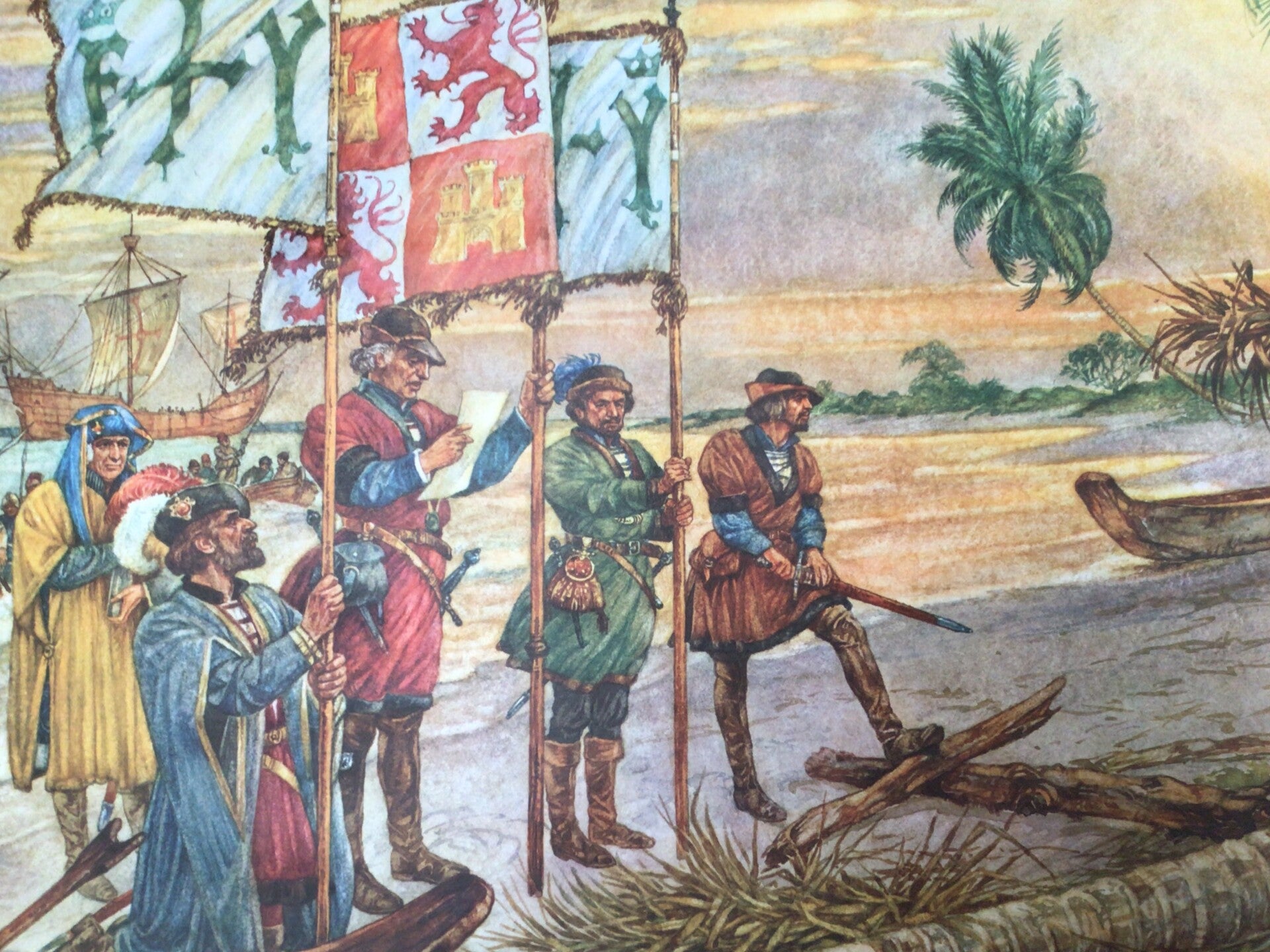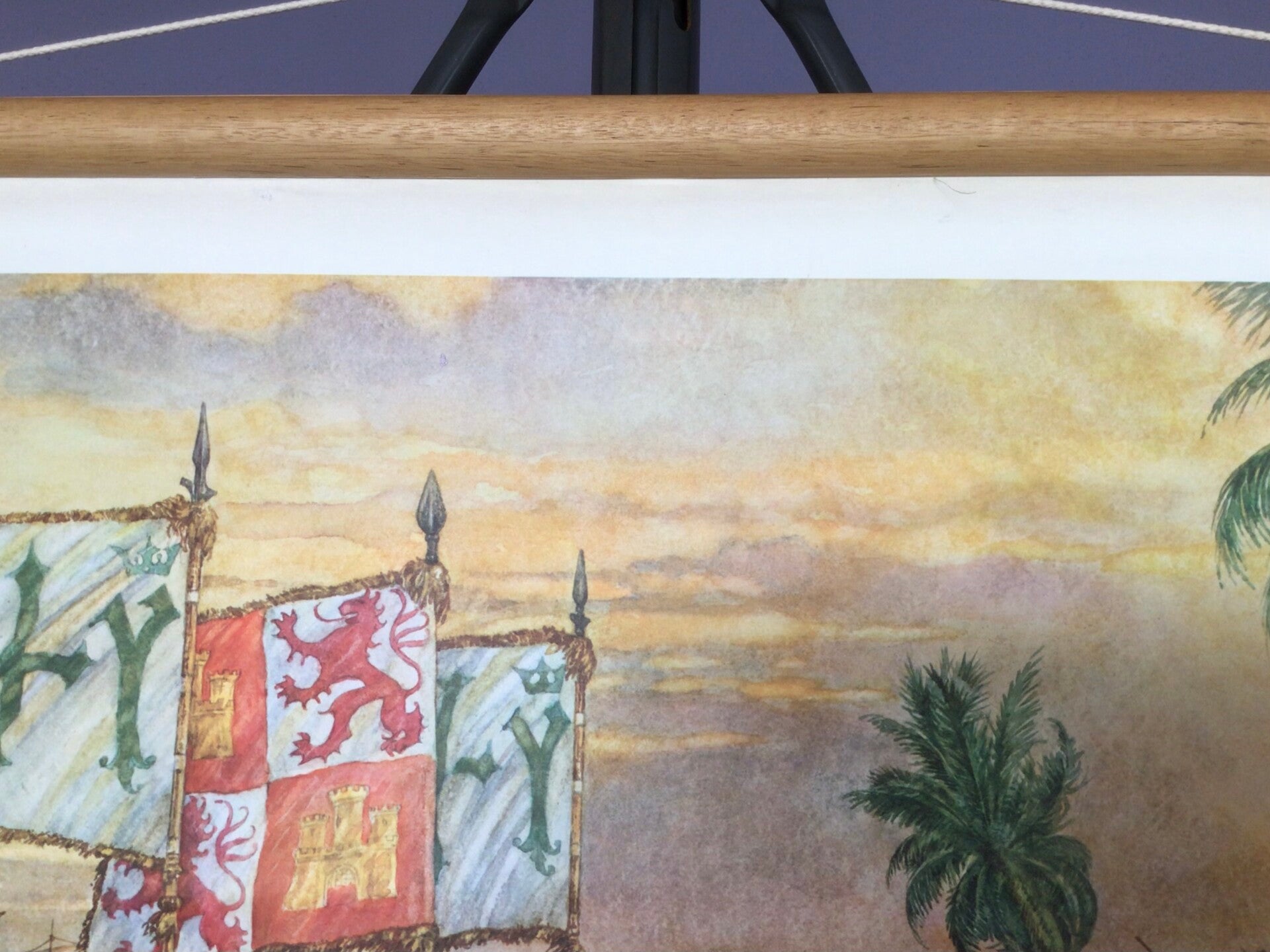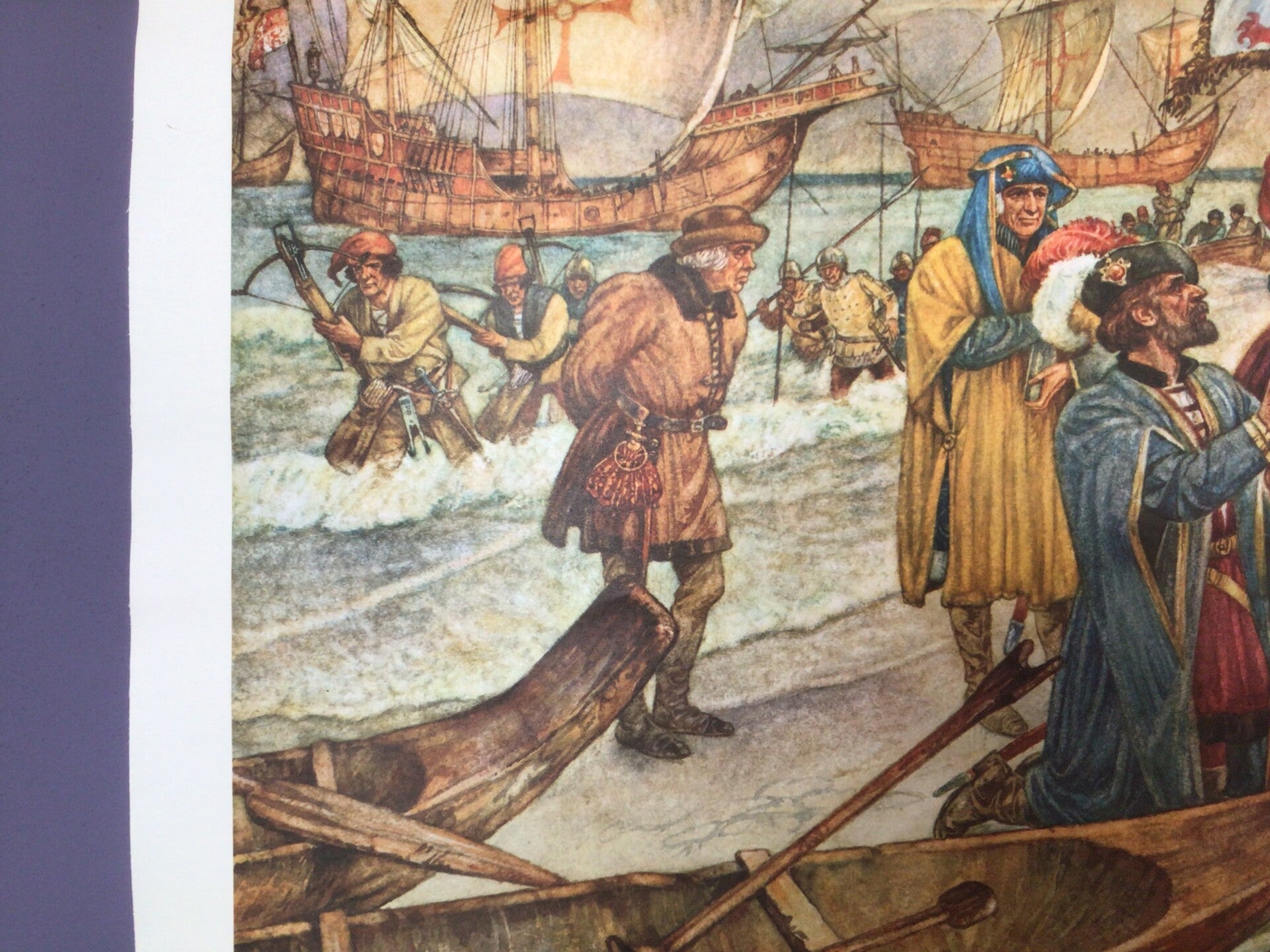 Oude Schoolkaart Columbus neemt Guanahani in bezit (1492)