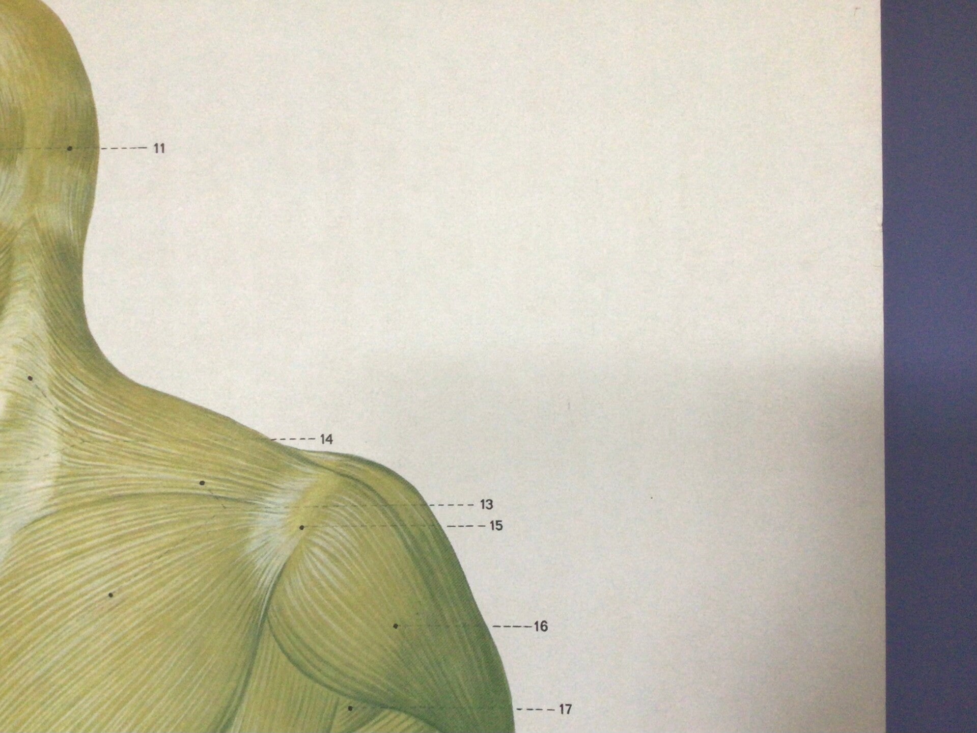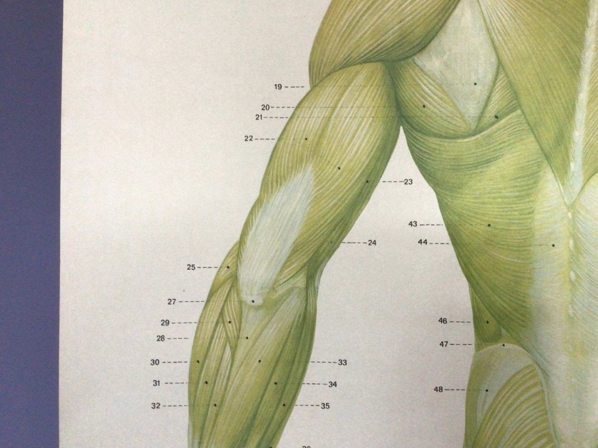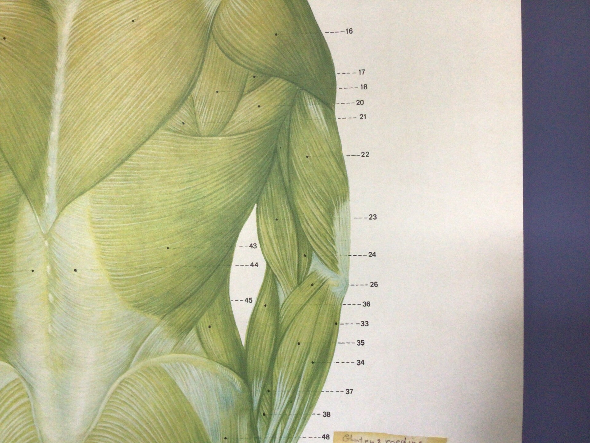 De kaart verkeert in goede staat. Een ijverige docent heeft de namen van de spieren erbij gezet.