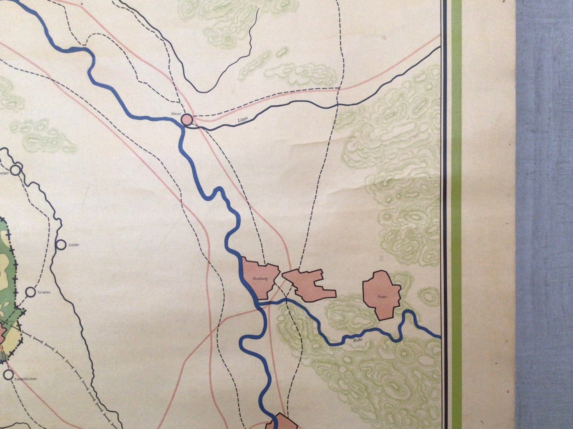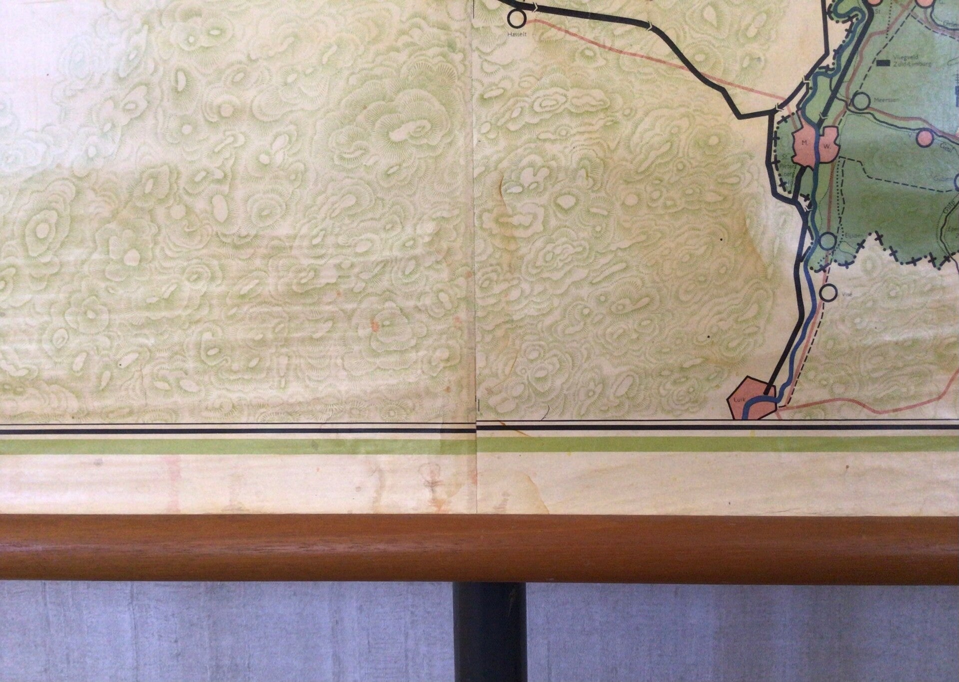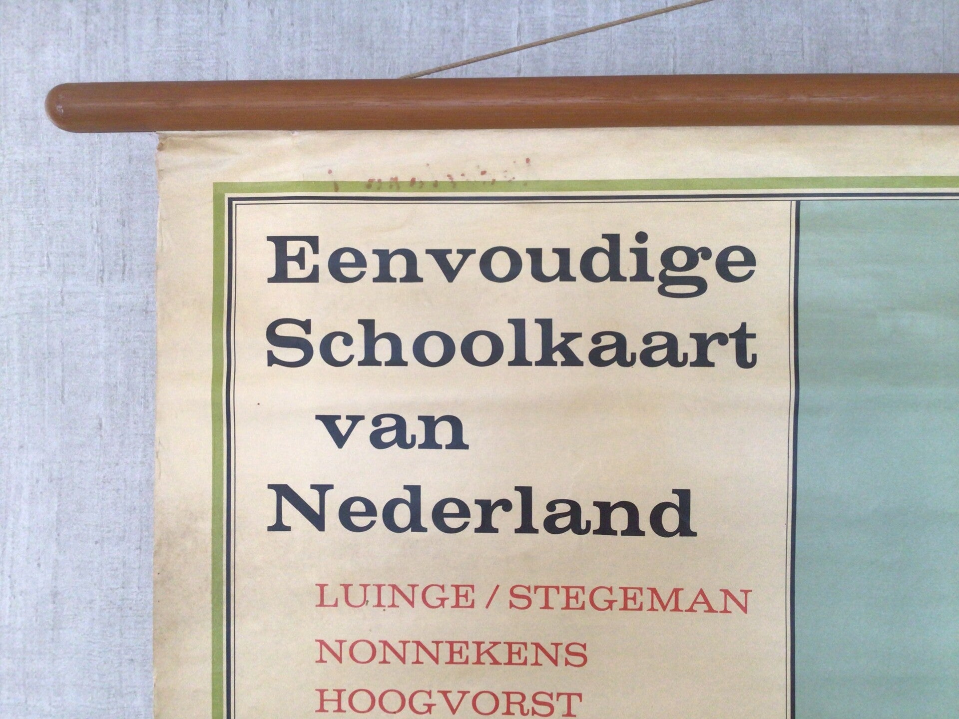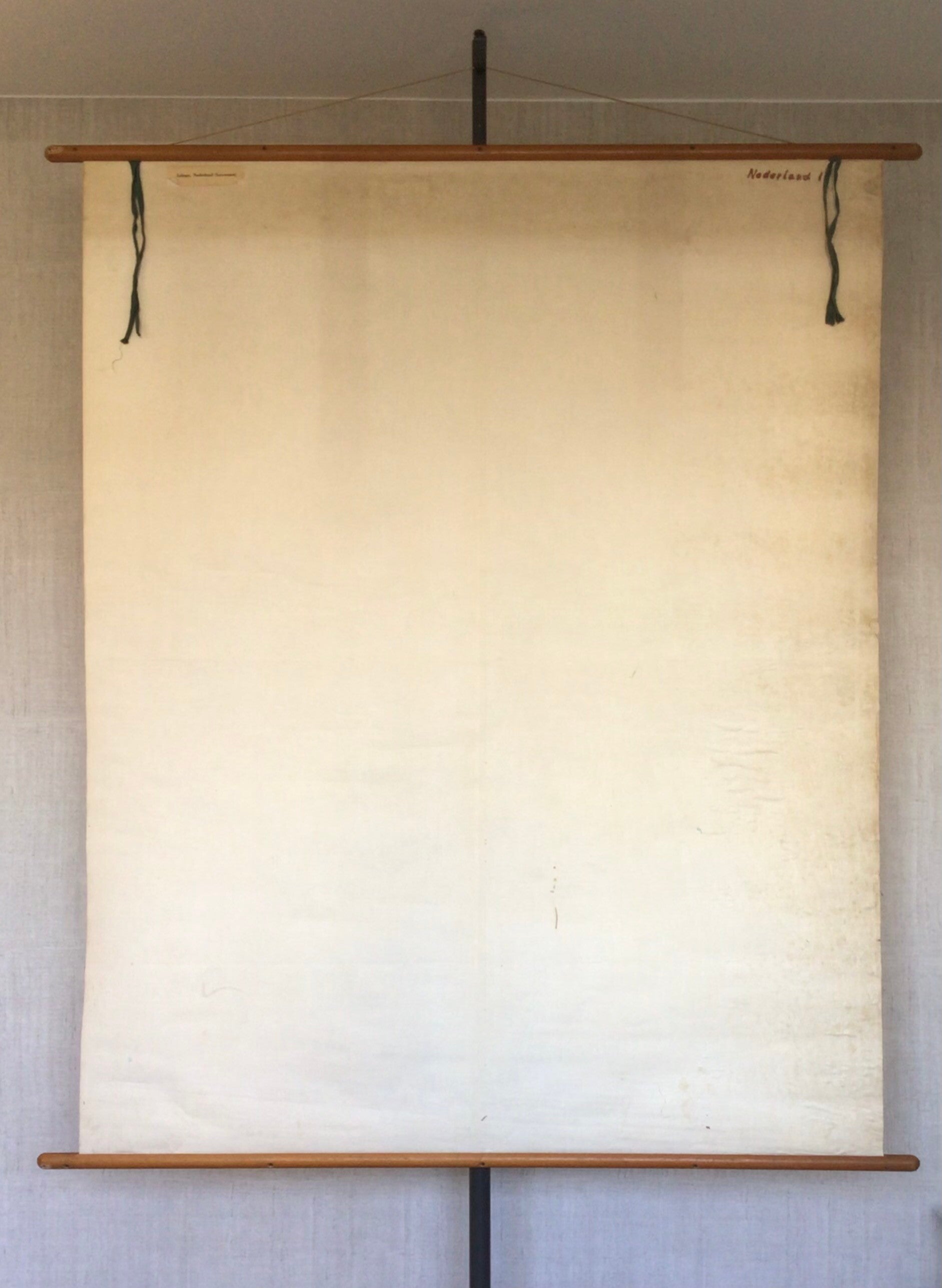 De kaart is op linnen bevestigd, oprolbaar en voorzien van houten stokken.