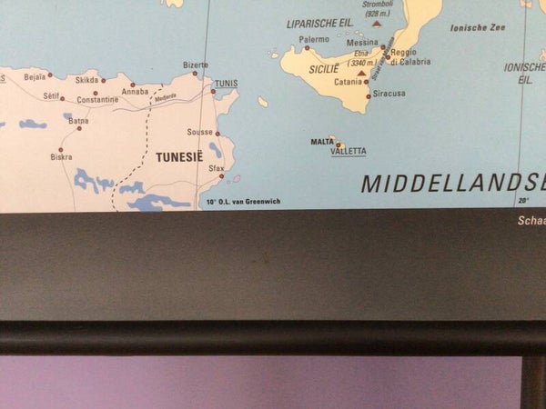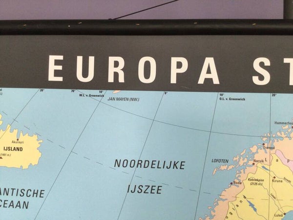 Tweezijdige kaart op stevig vinyl, oprolbaar met houten stokken. De kaart toont namen van staten, plaatsen, wateren en bevat een handige legenda.