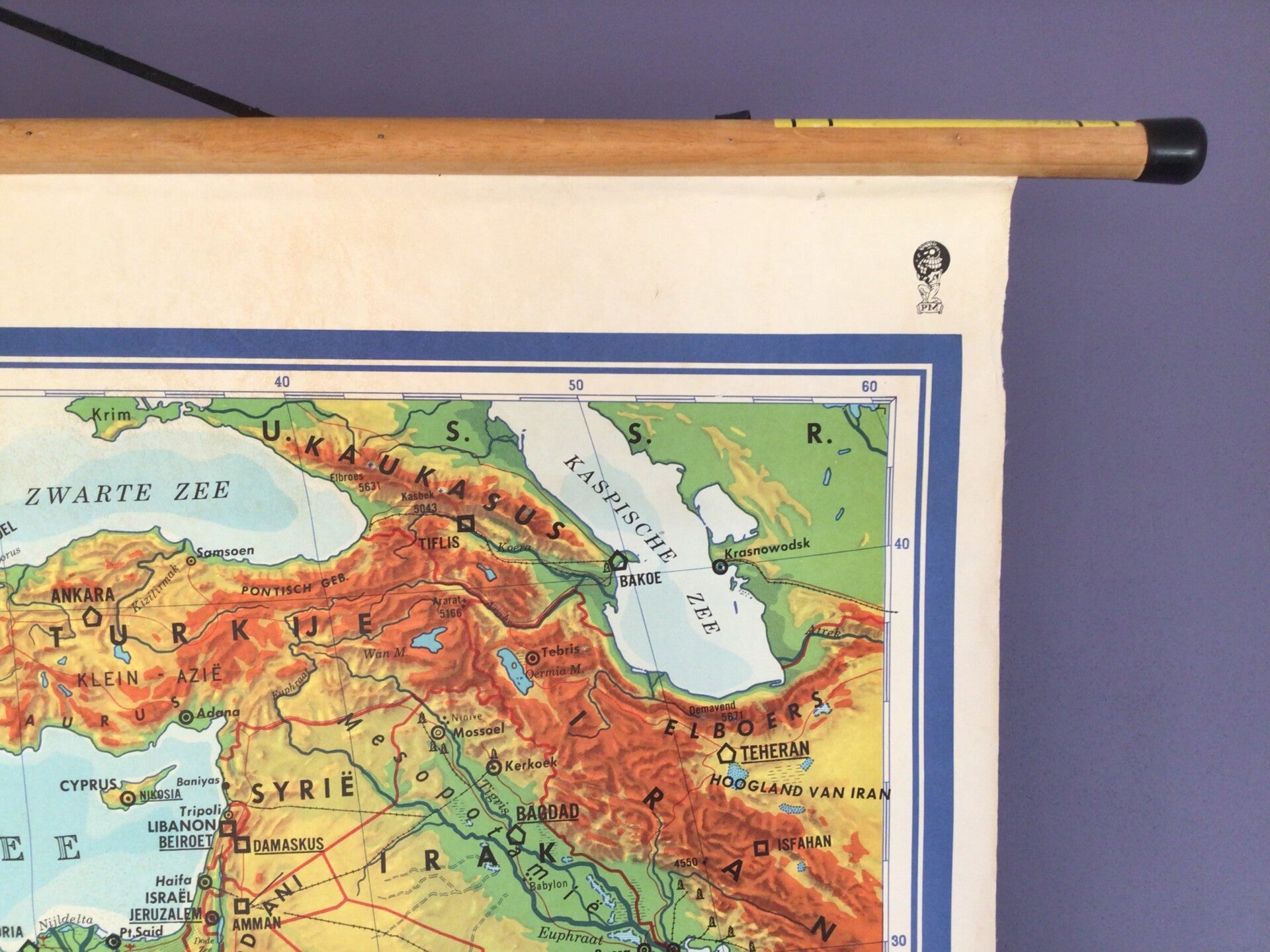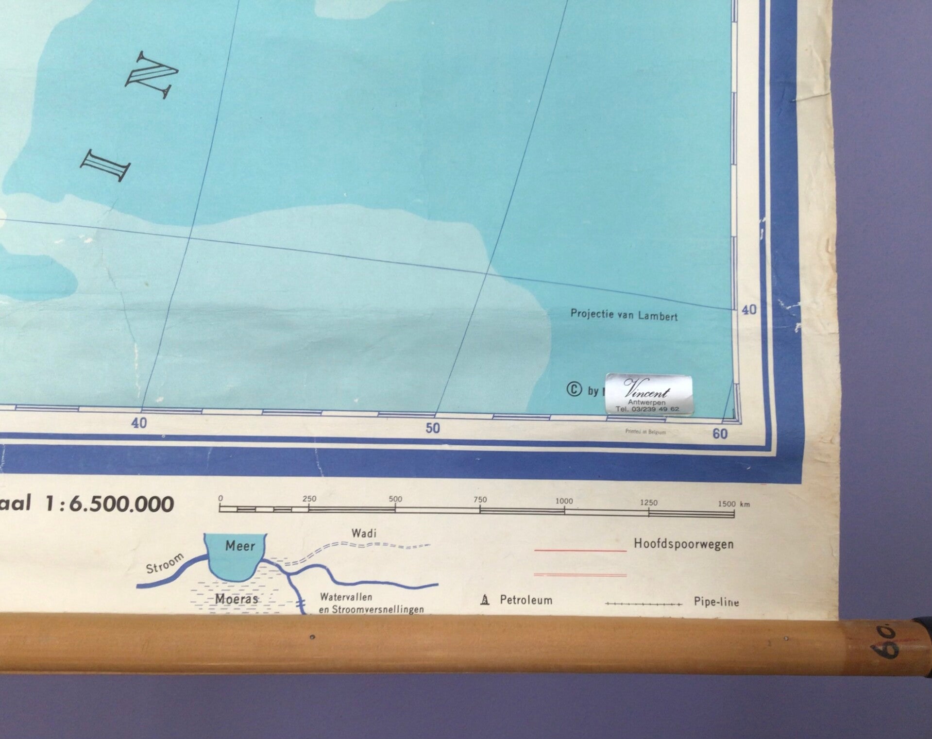 Zeer gedetailleerde oude kaart van papier op linnen en oprolbaar met stokken.