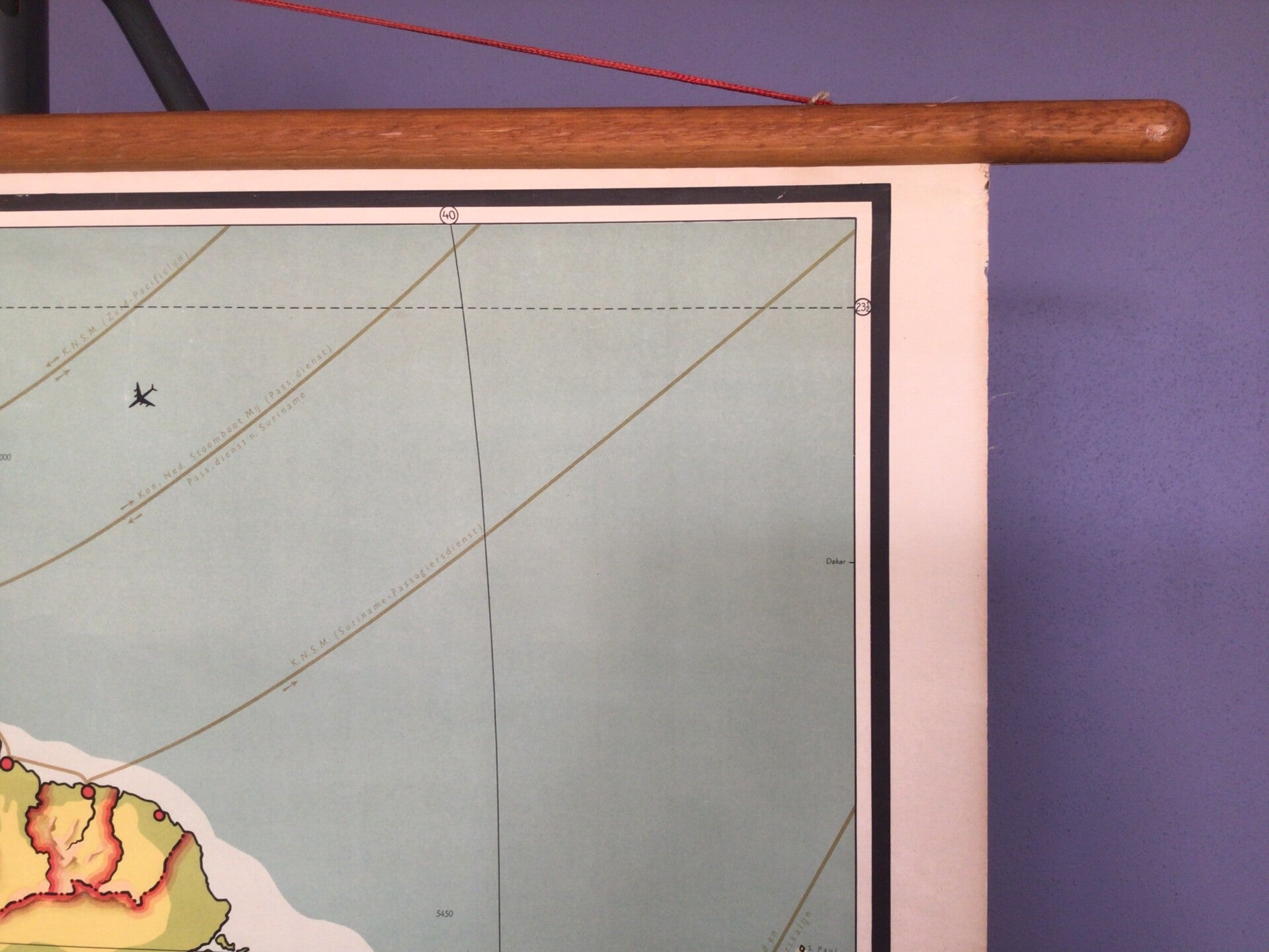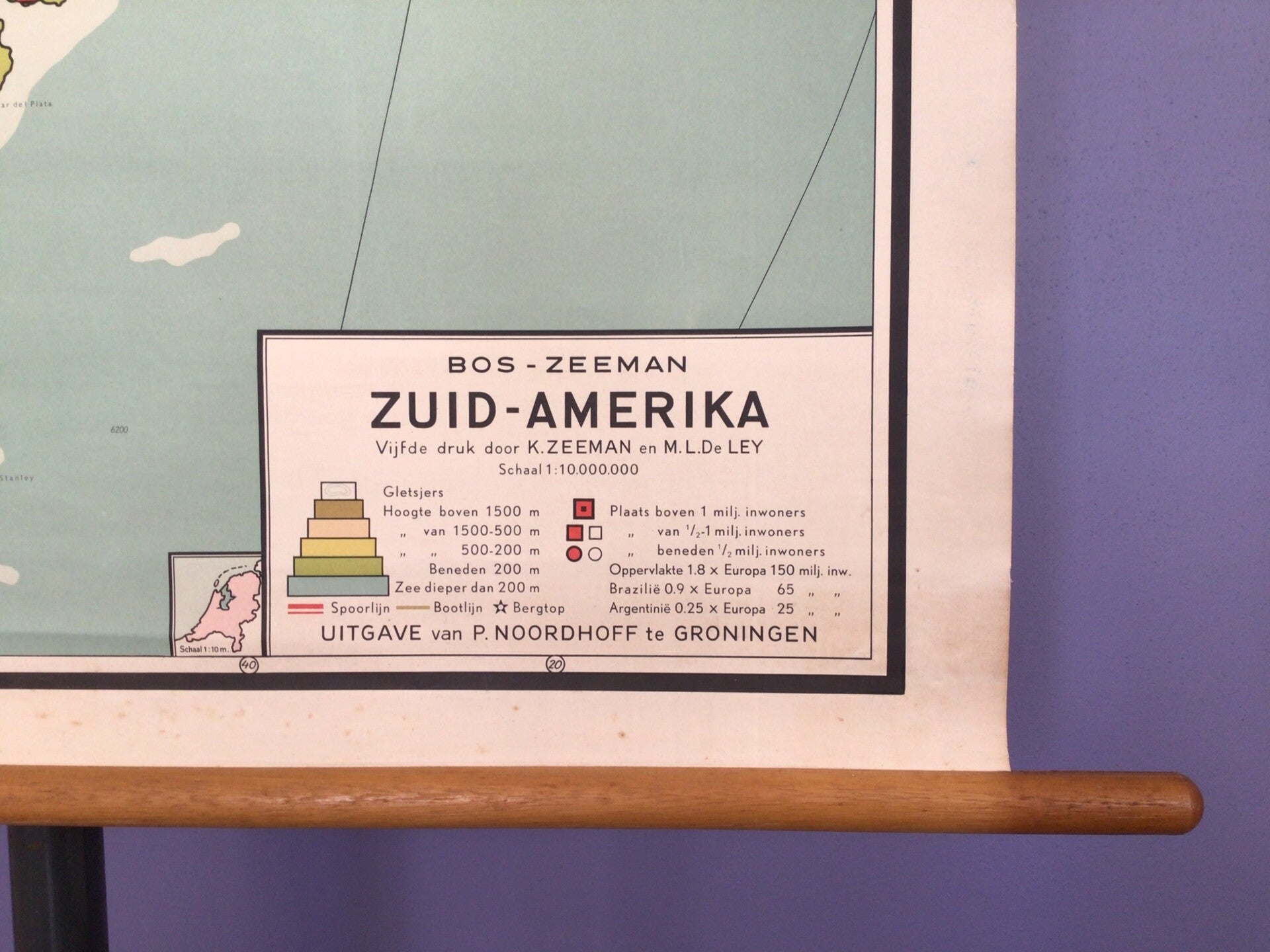 Oude kaart van R. Bos en K. Zeeman, uitgegeven door P. Noordhoff te Groningen (vijfde druk), gedrukt op linnen en oprolbaar op stokken.