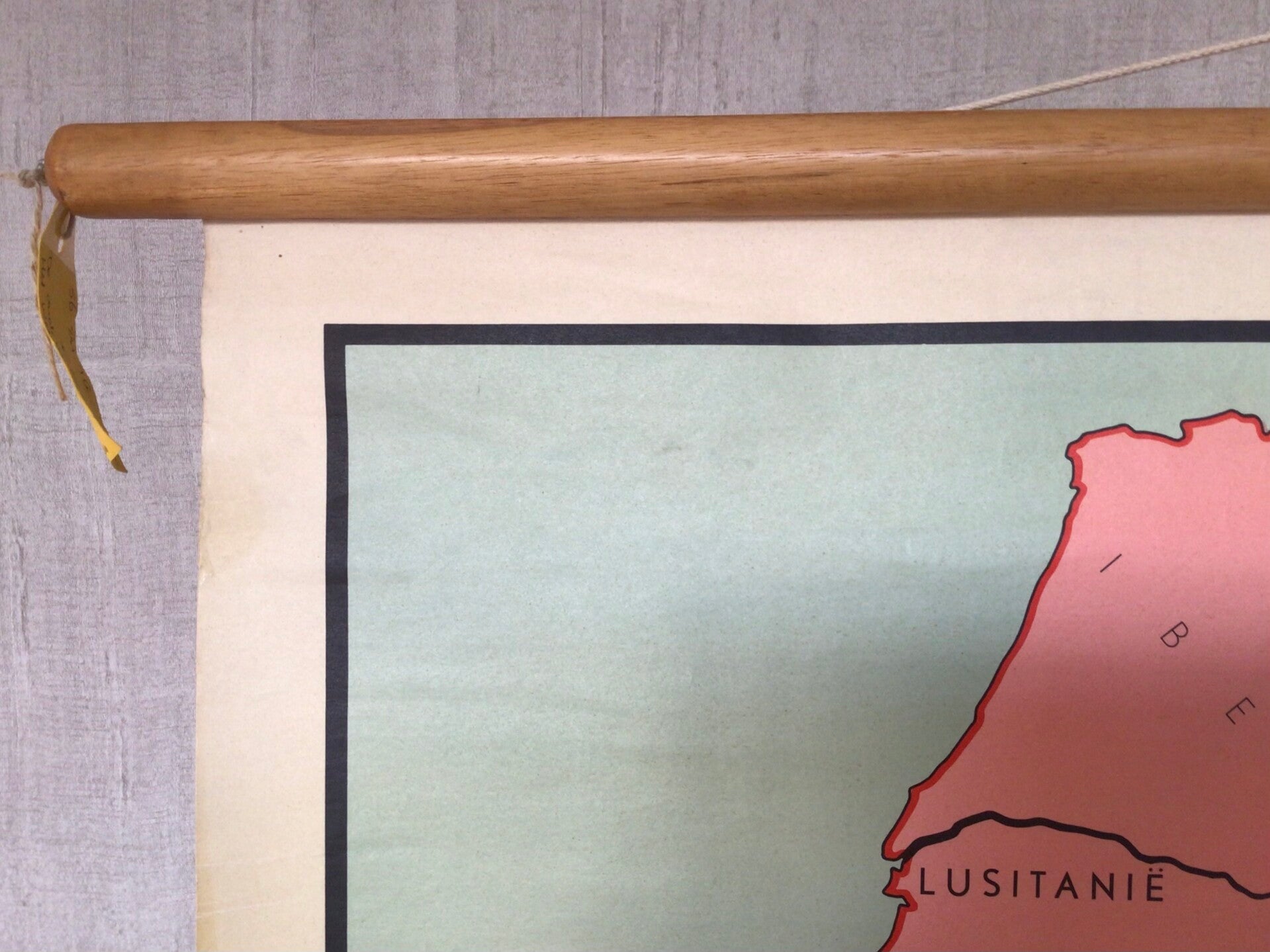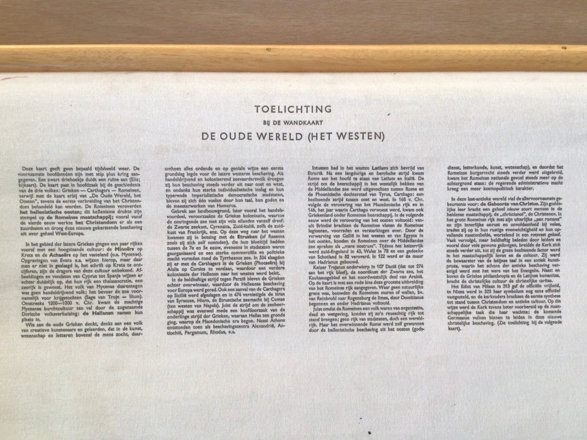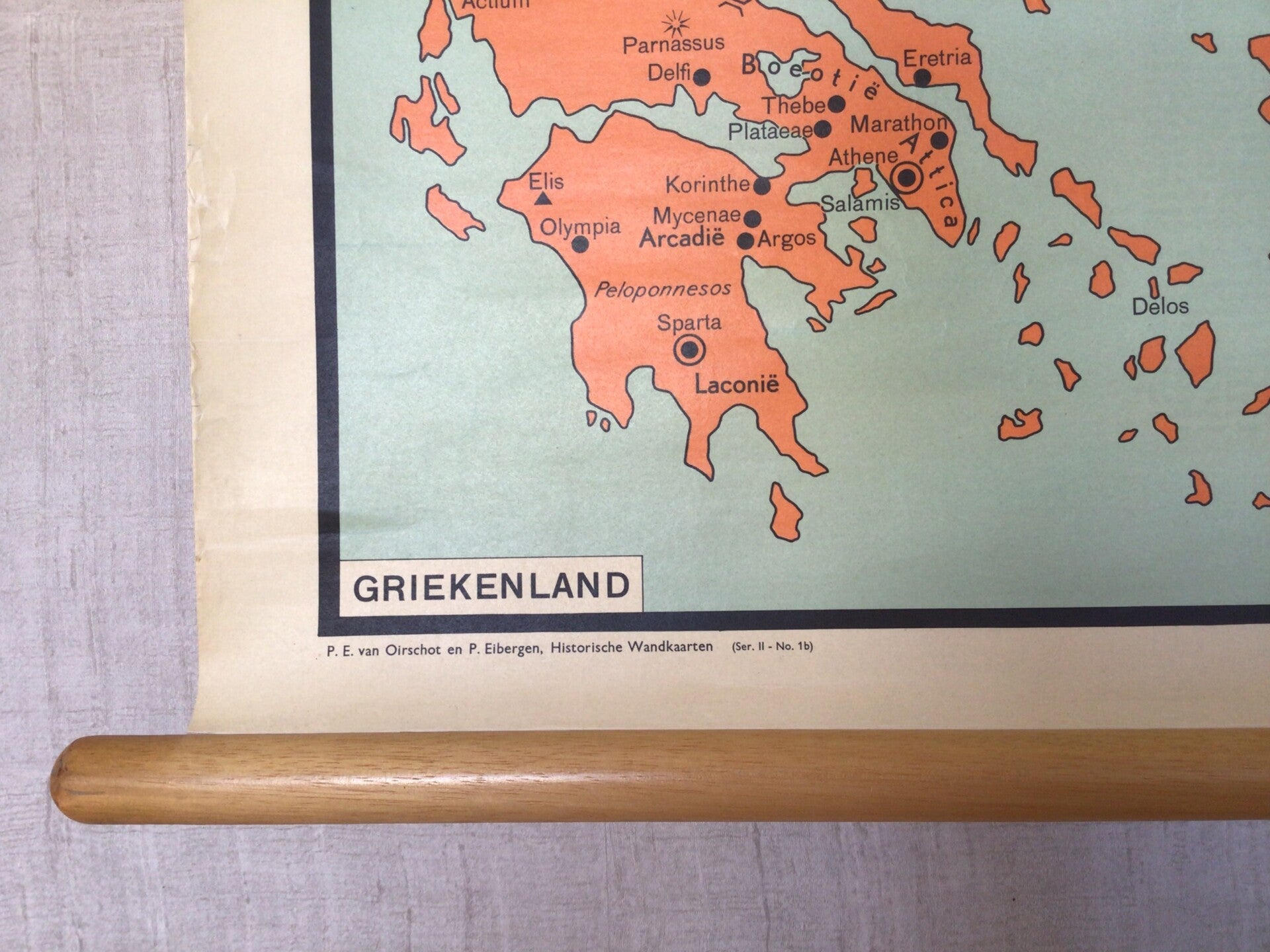 Mooie kaart uit de serie 'Historische Wandkaarten (Ser. II No. 1b) van P.E. van Oirschot en P. Eibergen, gedrukt op linnen en oprolbaar met stokken. Op de achterzijde is een toelichting gedrukt.
